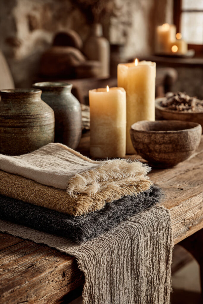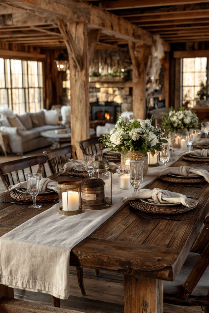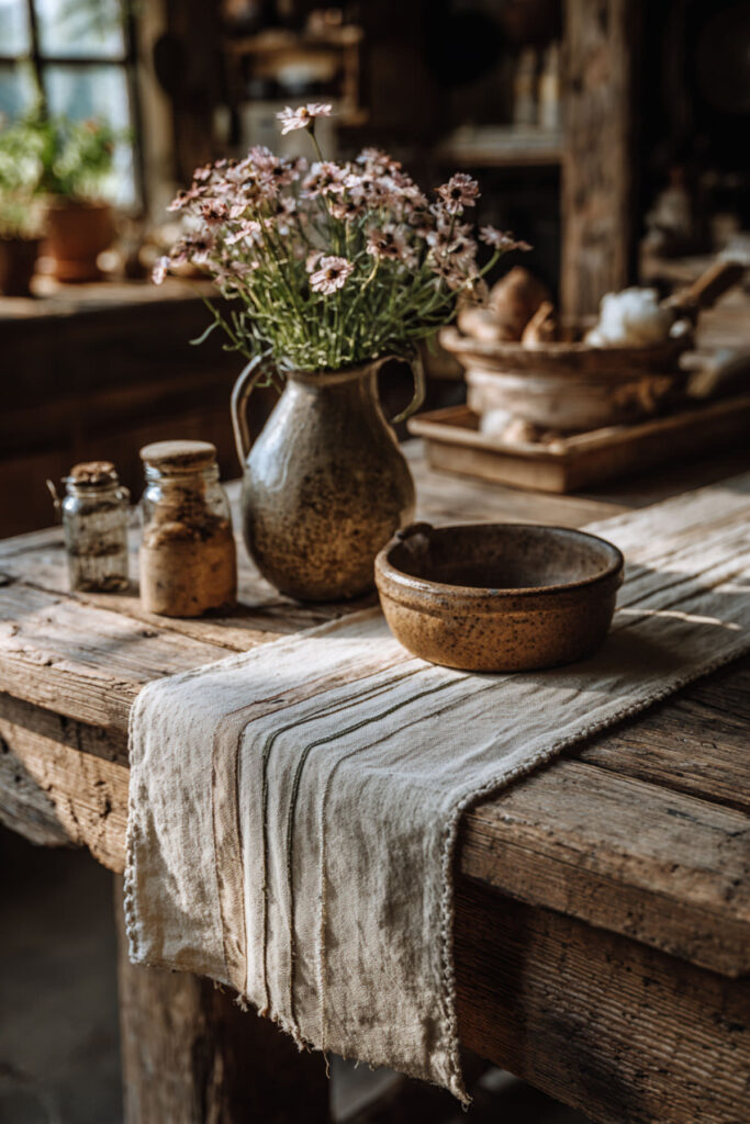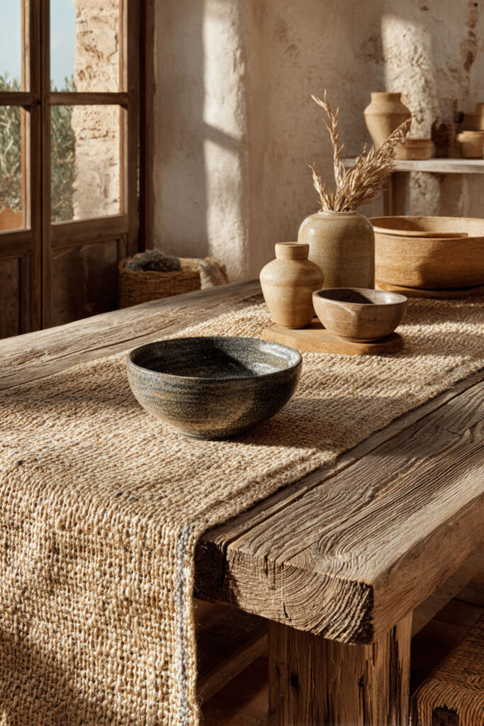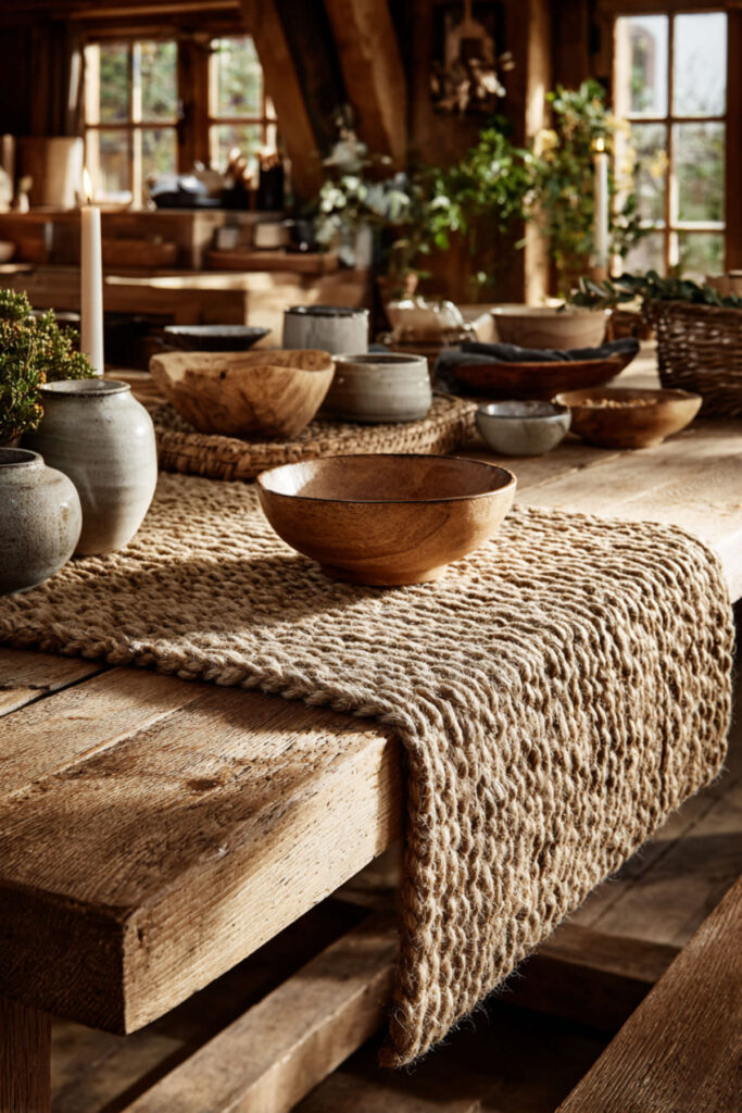 I recommend a handwoven jute runner with fringe or tasseled edges for added character. The natural fibers give it a slightly rough, honest feel that pairs beautifully with ceramic dishes, wooden serving boards, and simple stoneware. Rustic table runner ideas like this work especially well on reclaimed wood or dark-toned tables, where the contrast between the raw weave and the polished surface creates real visual interest. It’s a budget friendly decor move that adds way more personality than its price tag suggests.