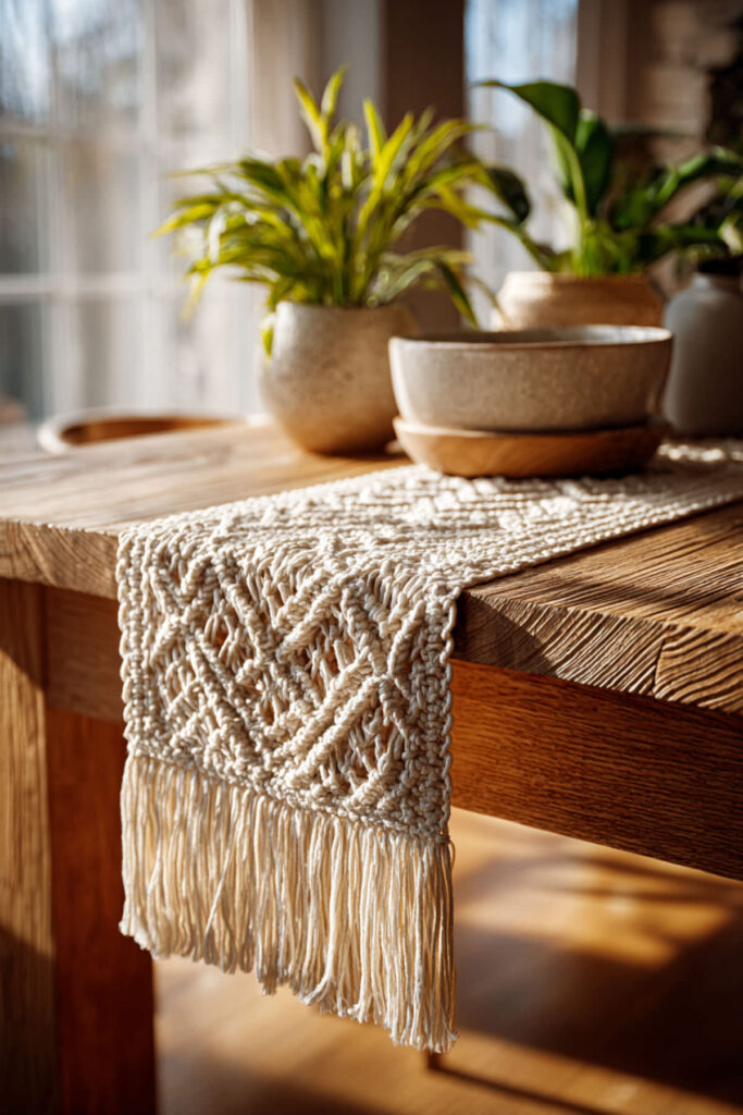 Macrame on a dining table? Absolutely. A macrame table runner brings this gorgeous, knotted texture that adds depth and personality without adding color — which makes it incredibly versatile. The open-weave pattern lets the table surface peek through, so it feels layered without being heavy. It’s boho without going overboard.