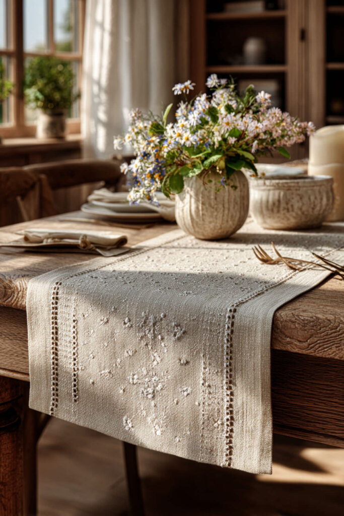 I recommend an embroidered table runner on a linen or cotton base in a neutral color with tonal or contrast stitching. Cream-on-cream embroidery looks incredibly elegant for everyday use, while a runner with colored thread in soft greens or dusty blues adds just enough visual interest for a dinner gathering. This is the kind of table runner decor that feels dressy without trying too hard — it’s appropriate for a casual Saturday brunch and a holiday dinner alike.