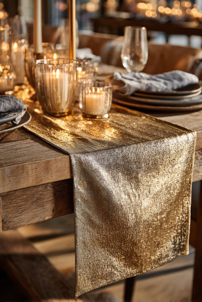 There are moments when a table calls for a little shimmer — a holiday dinner, an anniversary, a New Year’s celebration — and a gold table runner delivers that warmth without going over the top. Not bright, flashy gold. Think antique gold, champagne, or matte metallic — the kind of finish that glows softly in candlelight and adds richness to every plate and glass around it.