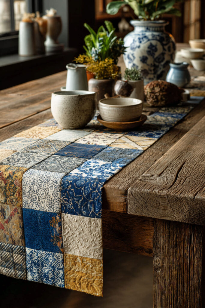 I recommend a patchwork quilted runner in coordinating (not matching) fabrics — stick to a shared color palette, like soft blues and creams, or warm reds and golds, and let the patterns do the mixing. A patch work table runner is also one of the best DIY table runner ideas if you have fabric scraps you’ve been holding onto. The beauty of patchwork is that the imperfections are the point. Every piece tells a tiny story, and together they create something that looks like it was made with real care and thought.