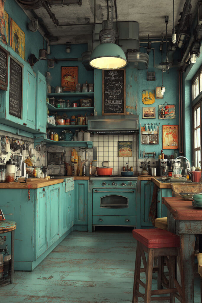 Blue country kitchen elements add warmth to the calming color. This style works with real life’s imperfections rather than demanding pristine maintenance. The coziness provides emotional insulation from external chaos.