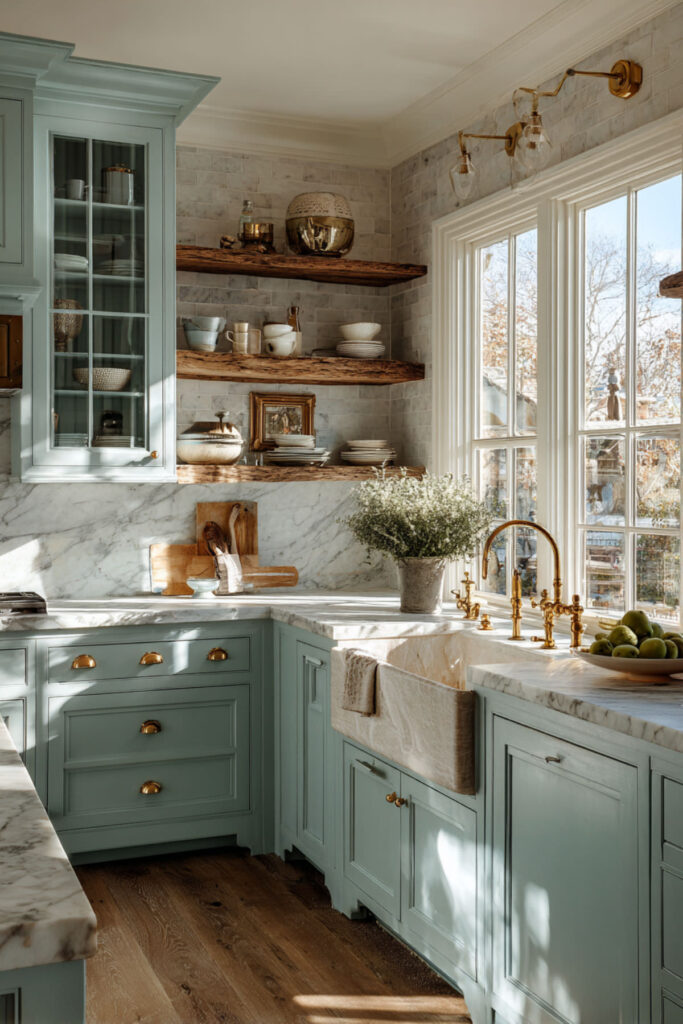 A built-in glass display cabinet enhances this palette, working year-round without feeling seasonal or trendy. The neutrality means your kitchen won’t fight with your mood on difficult days. These cabinets age gracefully, developing patina rather than looking worn.
