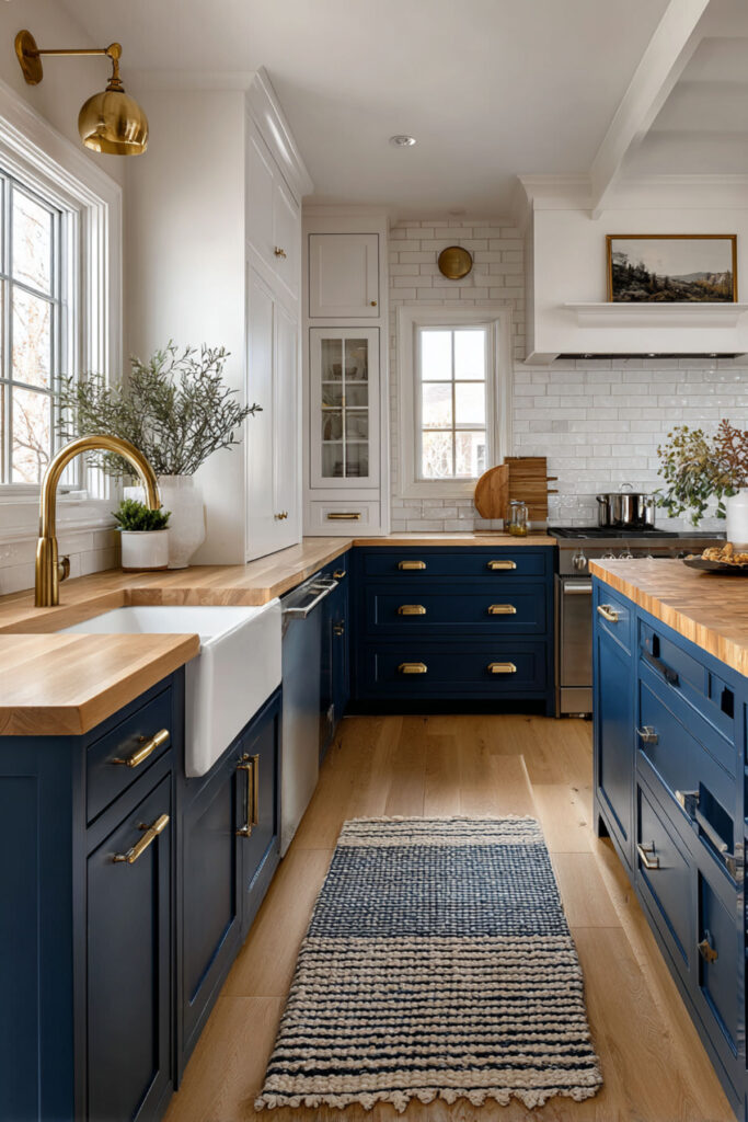 Lower blue kitchen cabinets with white uppers provide grounded calm where you need it most. Blue bottom cabinets anchor your workspace while maintaining overall brightness. Top white bottom blue cabinets create natural zones that help organize visual processing.