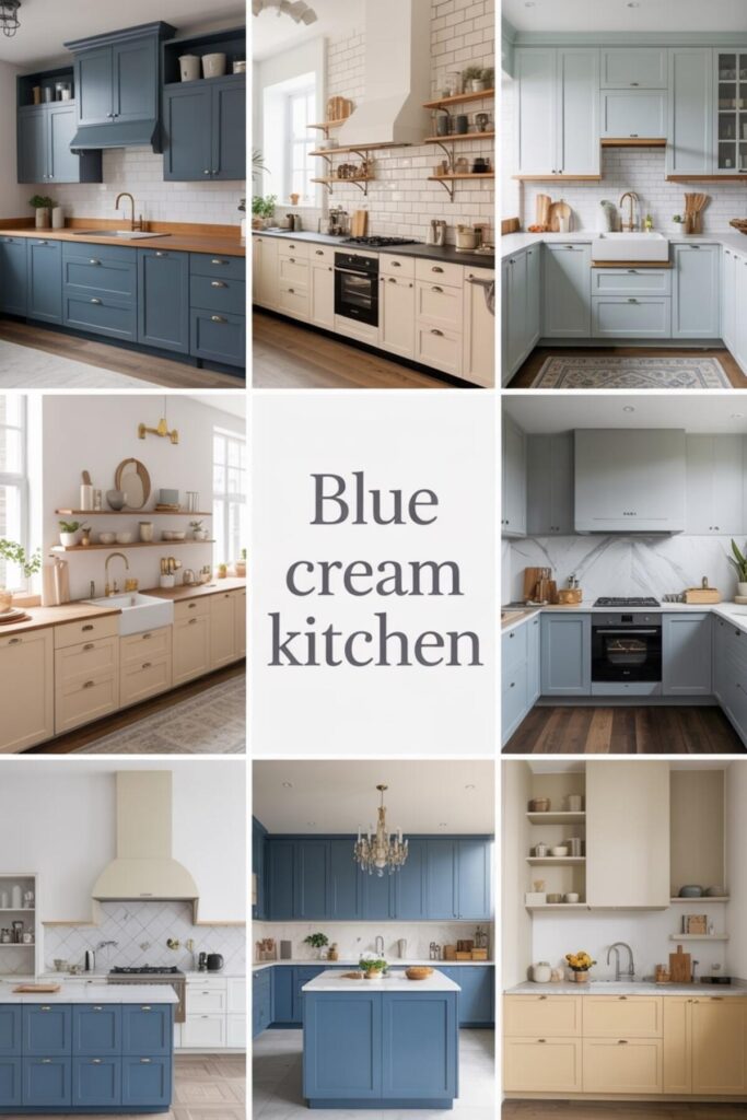 A cream blue kitchen creates soft layers that soothe without stark contrasts. Blue and cream kitchen combinations feel like visual cashmere – luxurious but gentle. The cream warms blue’s coolness while maintaining sophistication.