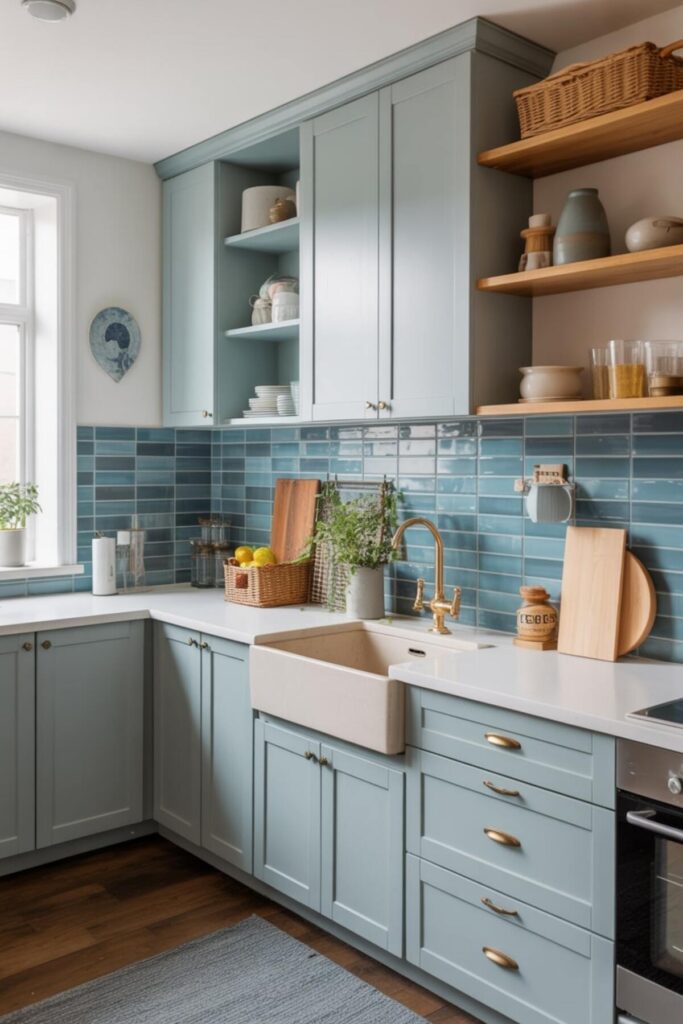 Cozy kitchen with blue tiles adds personality without overwhelming. The backsplash becomes a meditation point during repetitive tasks. This concentrated blue moment impacts mood without dominating the space.
