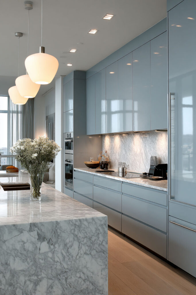 A modern blue kitchen hides complexity behind calm facades. Clean lines and hidden storage reduce visual triggers. Modern blue kitchen design emphasizes function without visible chaos. Integrated appliances disappear into blue cabinetry.
