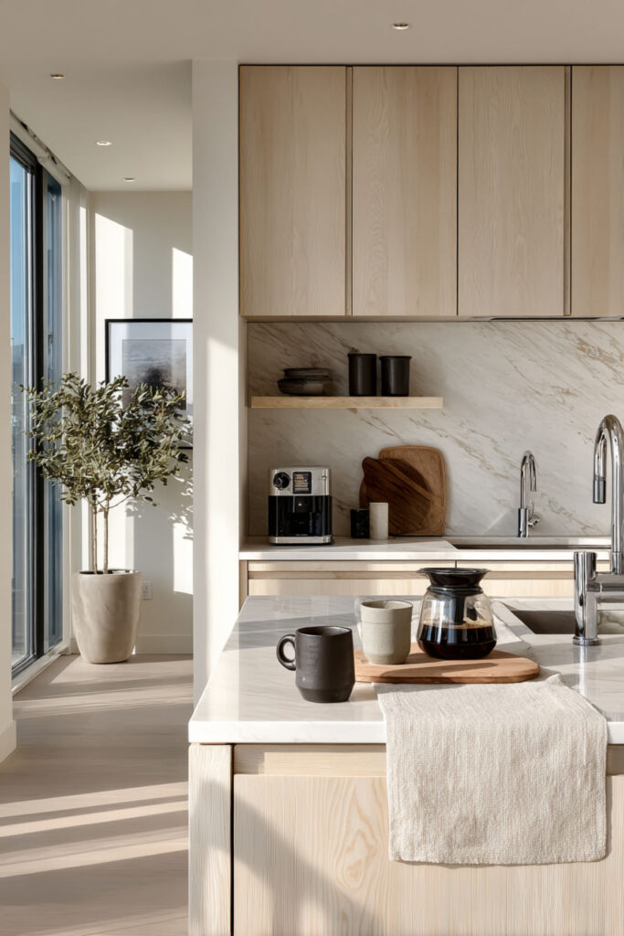 Japandi design merges Japanese minimalism with Scandinavian warmth – perfect for creating that sense of morning zen. Think light wood cabinets in oak or ash, clean lines without feeling cold, and coffee-toned accents through textiles and ceramics. Remove upper cabinets where possible, replacing them with floating shelves displaying beautiful coffee mugs and minimal dishware.