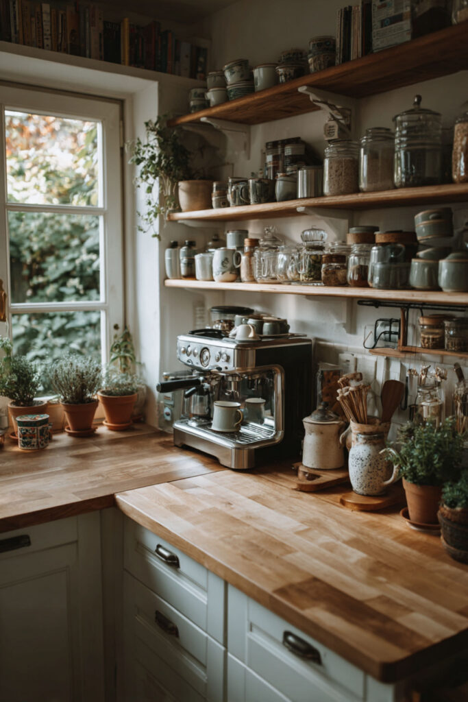 Scandinavian design’s clean lines don’t have to feel cold. Choose flat-panel cabinets in warm white or light wood, add coffee-toned hardware, and incorporate textiles in cream and caramel. The simplicity actually highlights morning rituals – your beautiful coffee maker becomes sculpture, your mug collection becomes art.