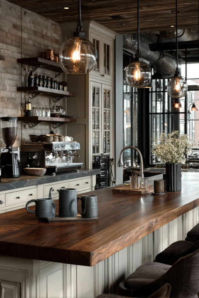 A wood island in an otherwise painted kitchen adds that coffee shop warmth instantly. Choose woods with brown undertones – walnut, cherry, or even reclaimed barn wood – rather than cool-toned grays. The natural grain provides visual interest without demanding attention. This organic element grounds the space and ages beautifully, developing more character over time.