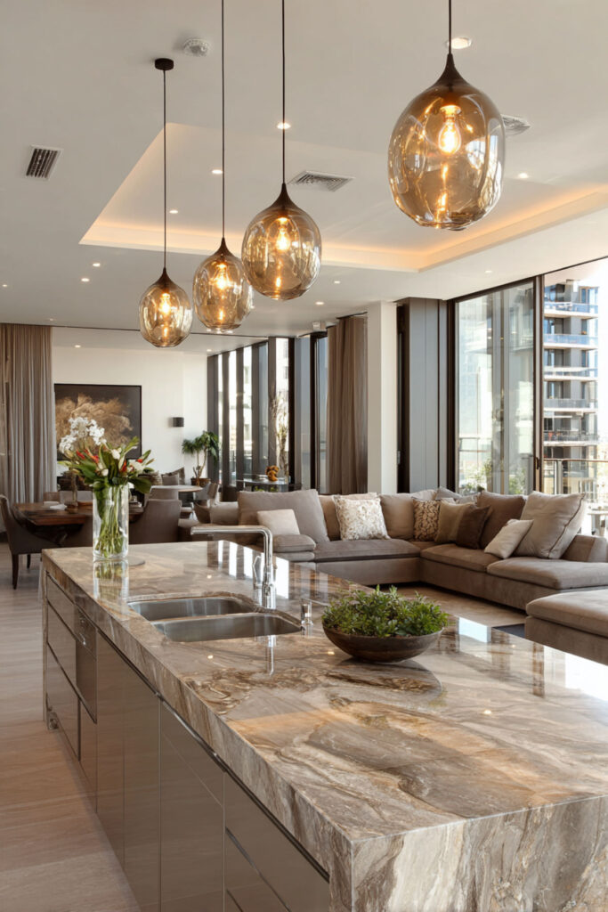 Open-plan kitchens with living areas need cohesive coffee-toned palettes that flow between spaces. Use the same wood tones in kitchen island and living room furniture, repeat cabinet colors in built-in shelving, and carry accent colors through both spaces via textiles and art.
