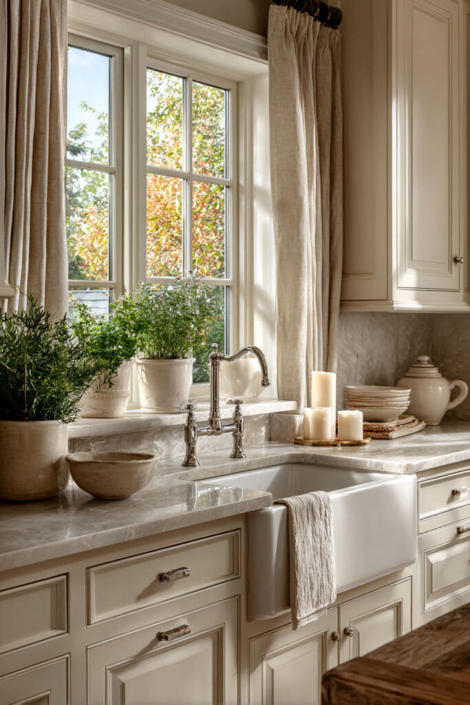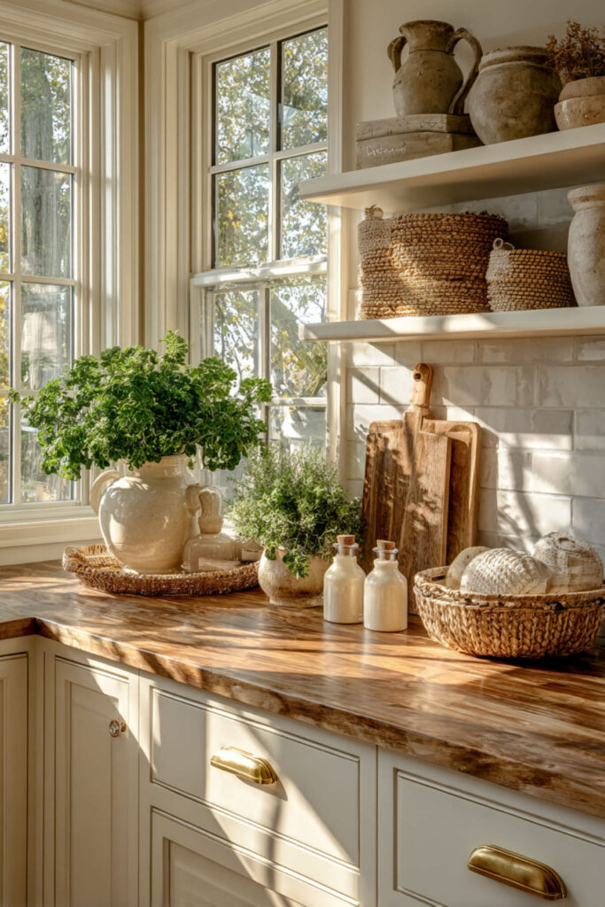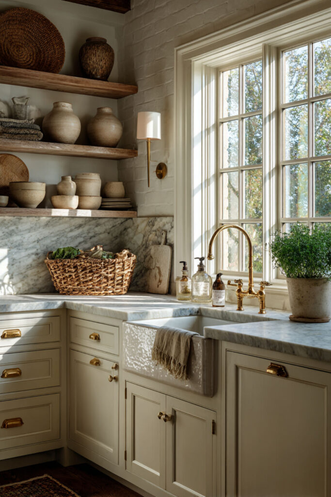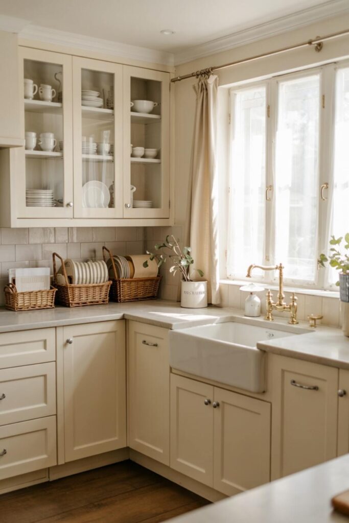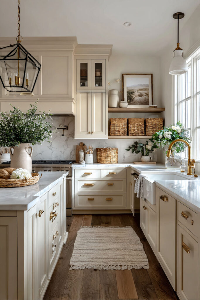 Pairing cream cabinets with light wood elements—think white oak floors, open shelving, or a natural wood island top—creates this Scandinavian-meets-farmhouse vibe that feels both current and comforting. The wood prevents the cream from feeling flat, while the painted cabinets keep the wood from overwhelming the space.