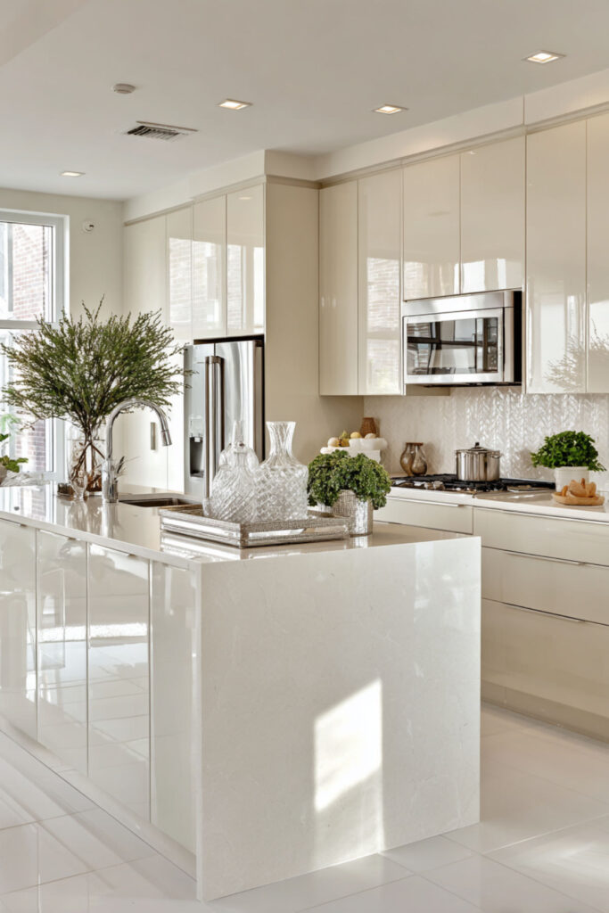 High-gloss cream cabinets bring unexpected modernity to this traditional color. That reflective surface bounces light around while the cream color keeps things warm—it’s like having the best of both worlds. Gloss works particularly well in smaller or darker kitchens where you need maximum light reflection.