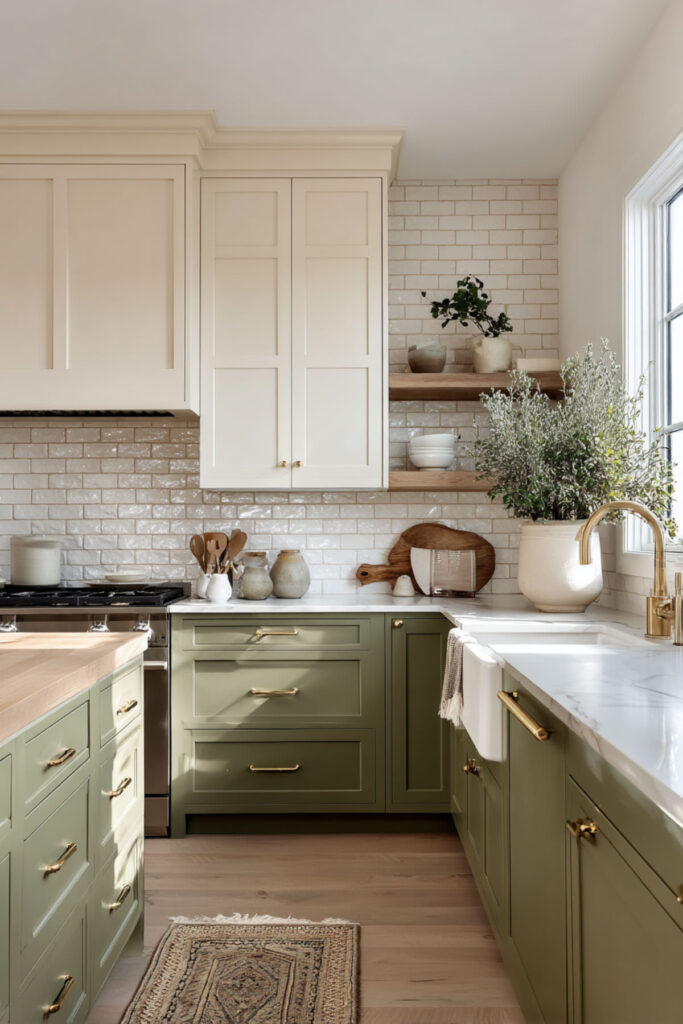 I highly recommend cream shaker cabinets on top with matte olive green lowers, separated by a warm-toned countertop in white quartz or honed marble. Brass or gold hardware ties the two tones together beautifully. It’s a cream and olive kitchen that feels sophisticated and incredibly easy to live with — no visual clutter, no competing colors, just a clean two-tone story that lets the rest of the room breathe.
