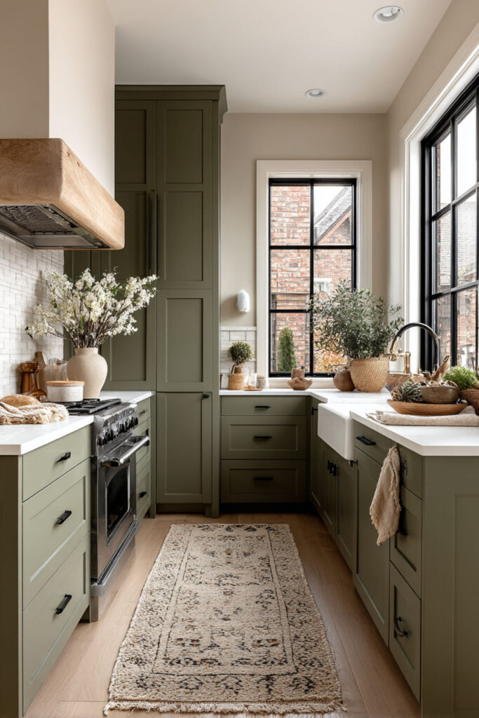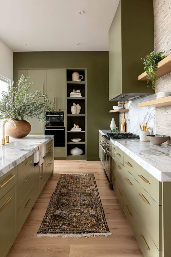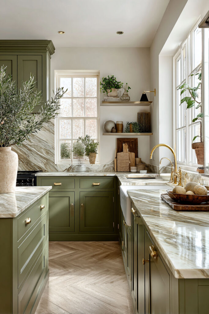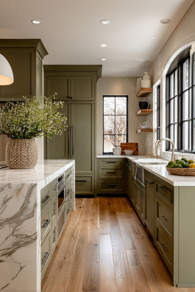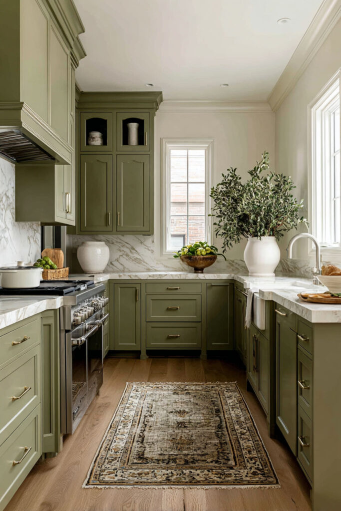 I recommend a matte olive green wall paint in a mid-toned shade — not too dark, not too gray — with warm cream shaker cabinets. Brass fixtures and a warm-toned countertop (think honed marble or a creamy quartz) keep the palette cohesive. It’s an olive green kitchen aesthetic that feels both grounded and fresh — two things that shouldn’t work together but absolutely do in this combination.