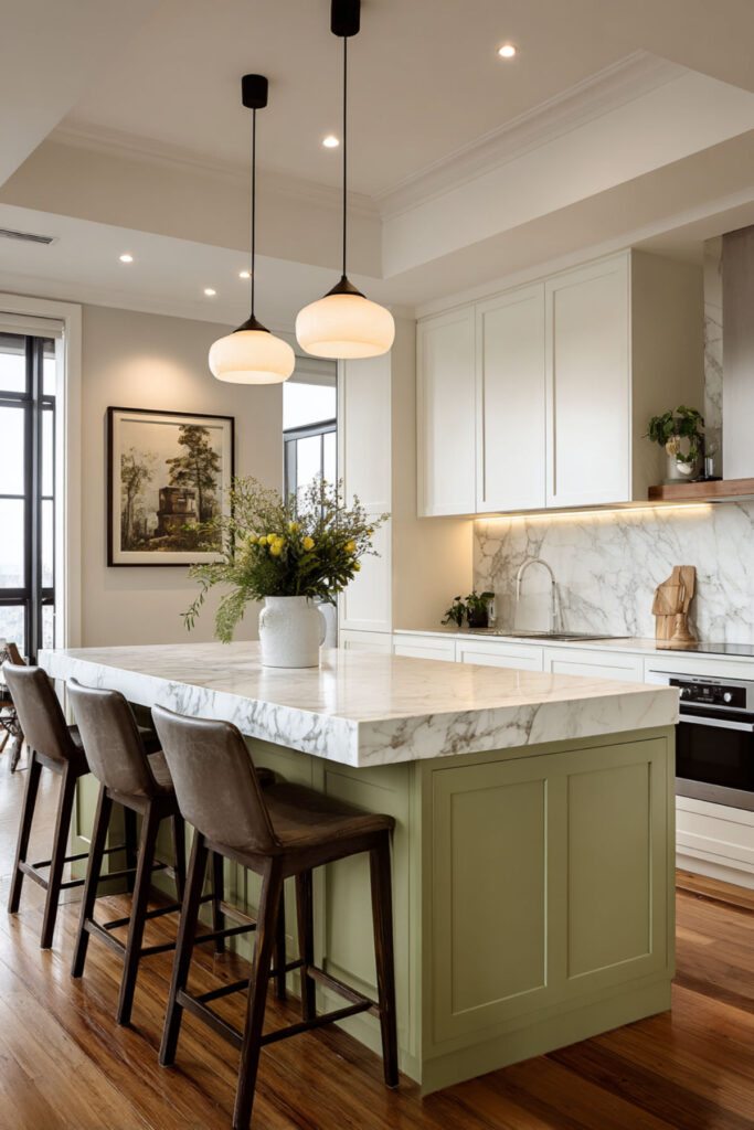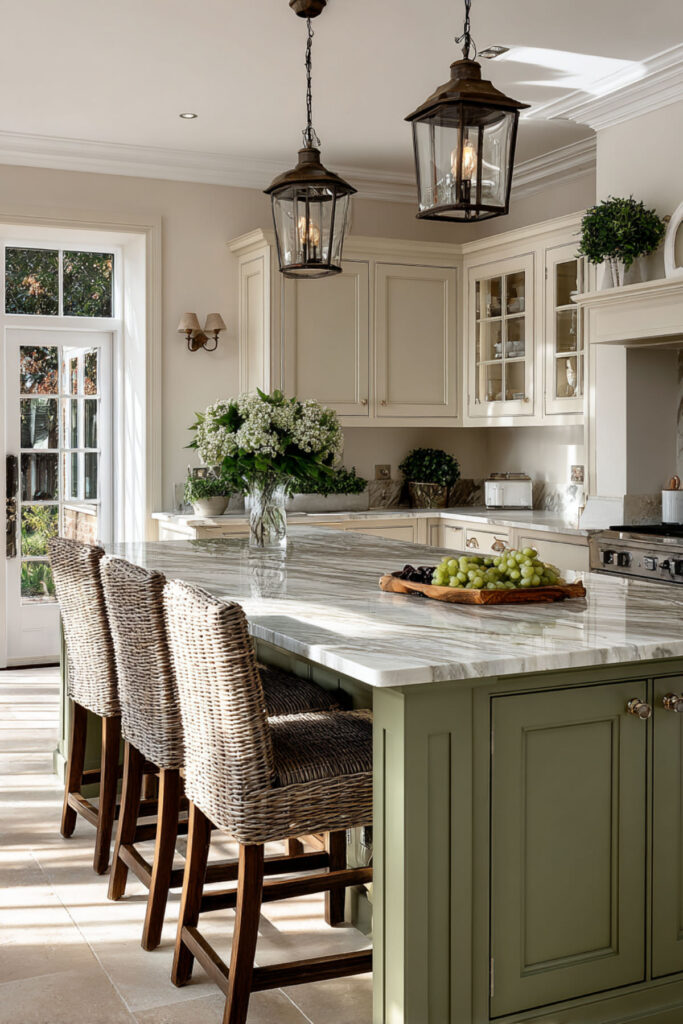 I recommend a generous olive green painted island with a cream marble or butcher block top, surrounded by cream perimeter cabinets. Three or four stools in natural wood or woven rattan keep the palette warm and textured. It’s the kind of kitchen where the island naturally becomes the center of everything — conversations, meals, morning coffee. One piece of olive transforms the whole room.