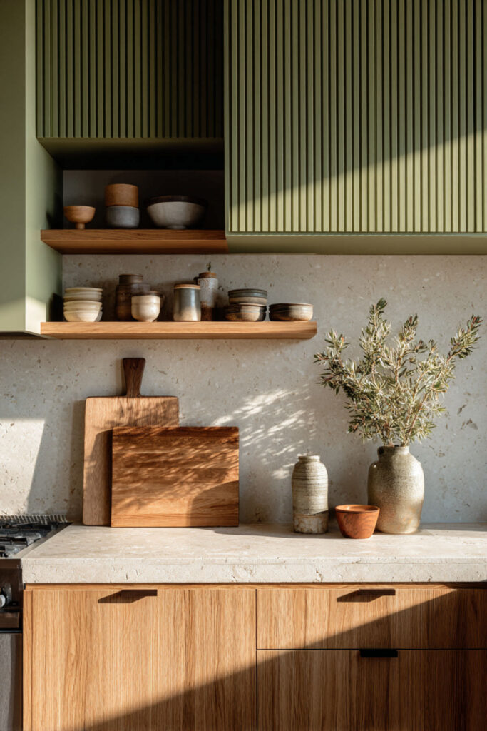 I recommend solid wood floating shelves in a warm cream finish mounted on an olive green accent wall behind the range or next to the sink. Keep only your most-used and most beautiful items on display — white plates, a few glass jars, a ceramic pitcher, one or two cookbooks. Everything else goes behind closed doors. This is the key to warmth without clutter: show the things you love, hide the things you don’t. It’s olive green kitchen decor that’s as practical as it is pretty.