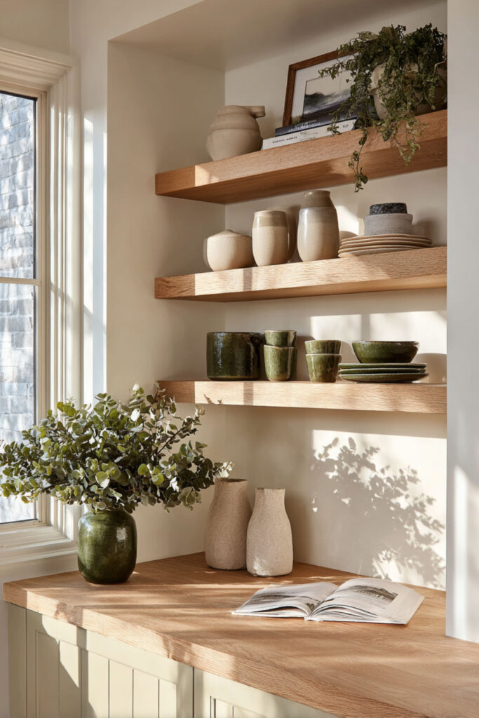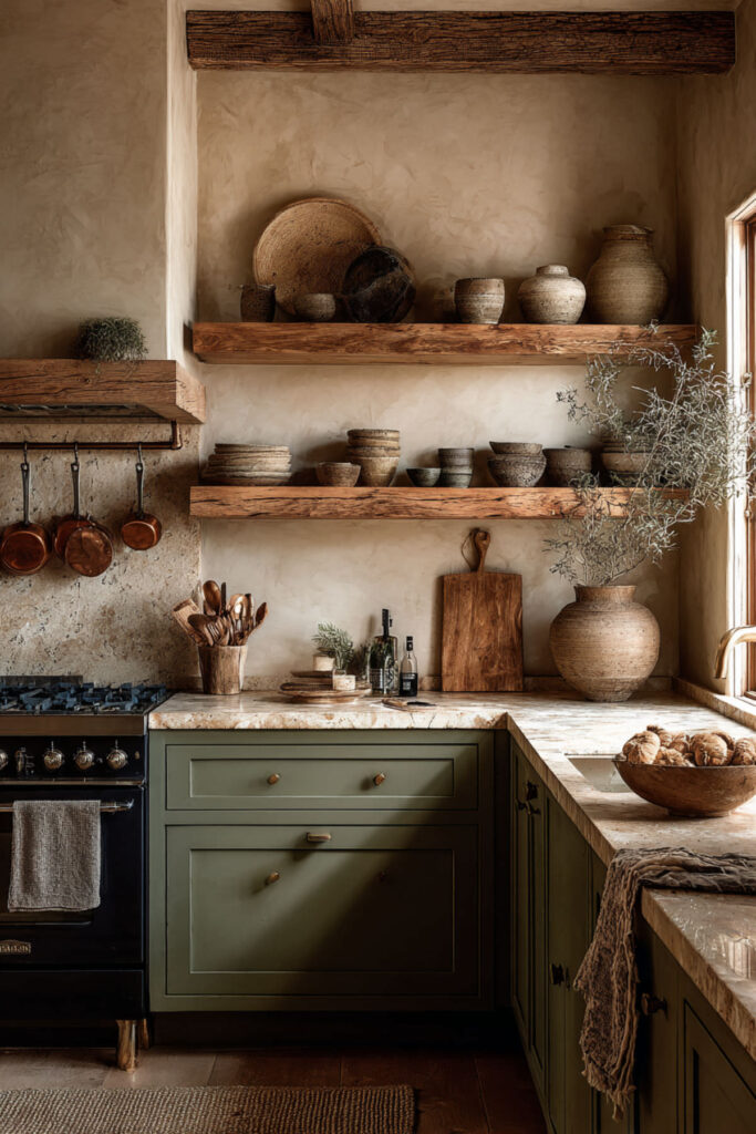 Open shelving is one of the best tools for a kitchen that feels warm but not cluttered — as long as you edit what goes on the shelves. Against a cream wall, olive green open shelves (or cream shelves against olive green walls) create this beautiful two-tone display that turns your everyday dishes and pantry staples into part of the decor.