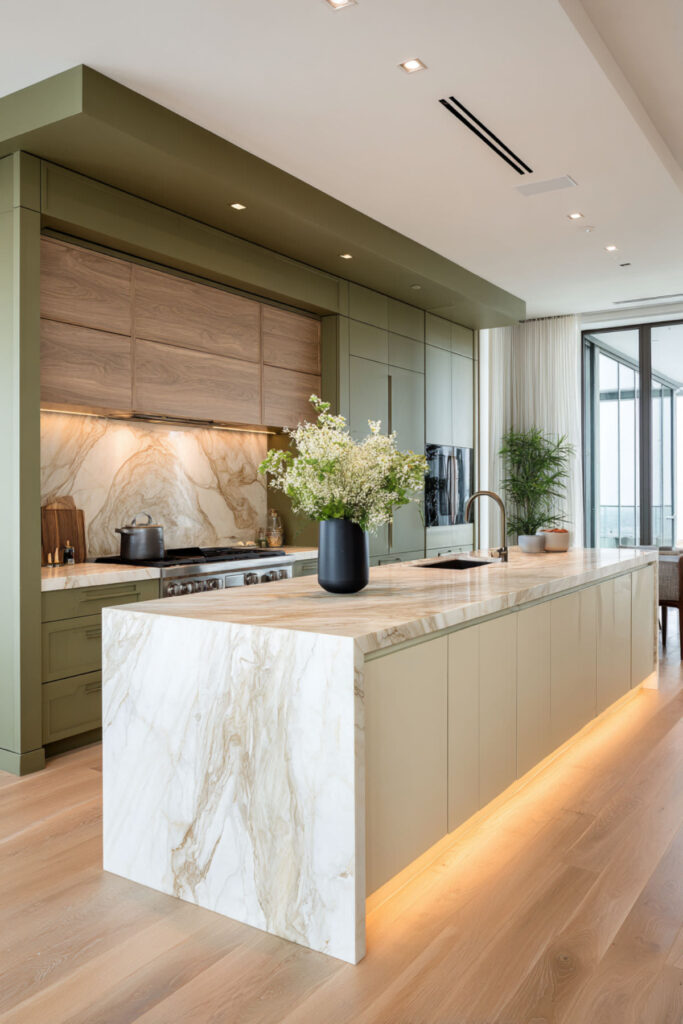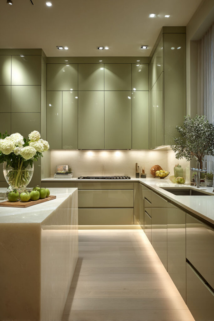 I recommend handleless cream slab cabinets with push-to-open hardware on the perimeter, paired with an olive green painted island with slim brass bar pulls. A cream quartz countertop and a micro-cement or matching cream backsplash keep the lines simple. It’s a modern olive green kitchen that proves you can have warmth and minimalism in the same room — you just need the right colors to do it.