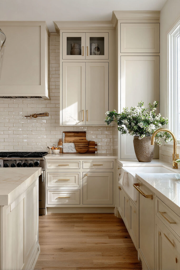 I recommend olive green shaker cabinets (uppers and lowers) with cream plaster walls, cream quartz countertops, and a cream tile backsplash. Natural wood flooring in a warm honey tone and brass hardware complete the picture. It’s a kitchen that feels like a single, clear thought — the kind of room where nothing competes for attention and everything feels right. And when the afternoon light comes through the window and hits that olive and cream palette? It’s the quietest, warmest kind of beautiful there is. That’s the whole point, isn’t it?