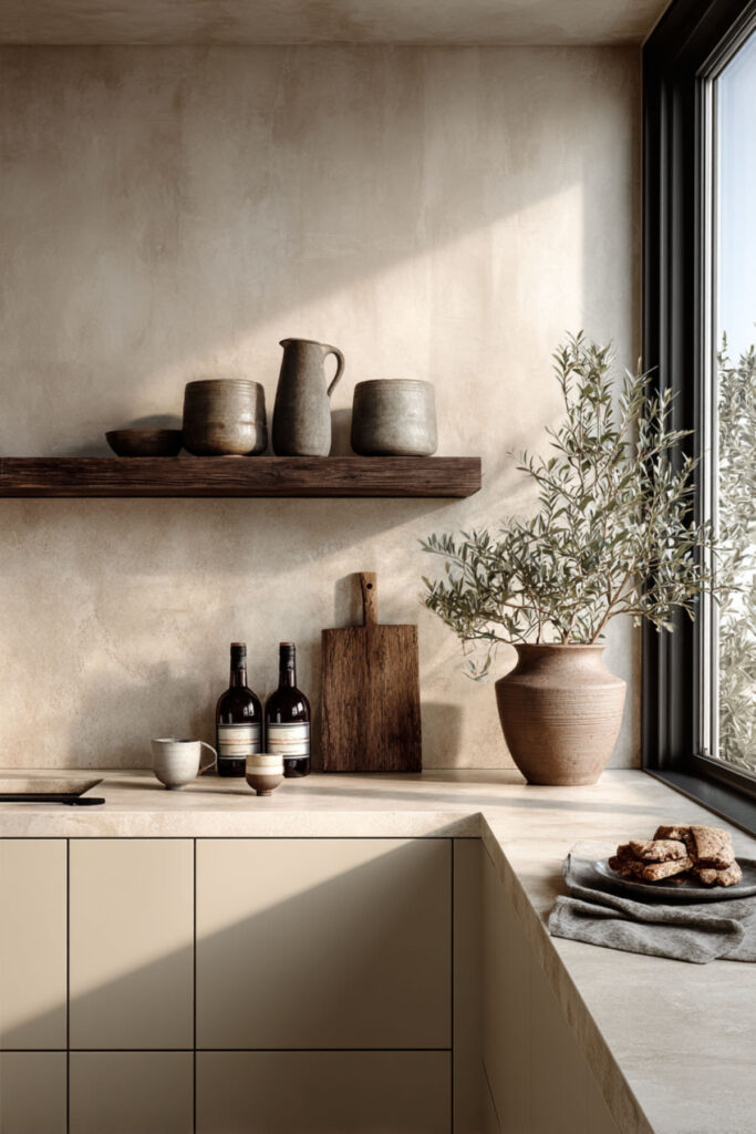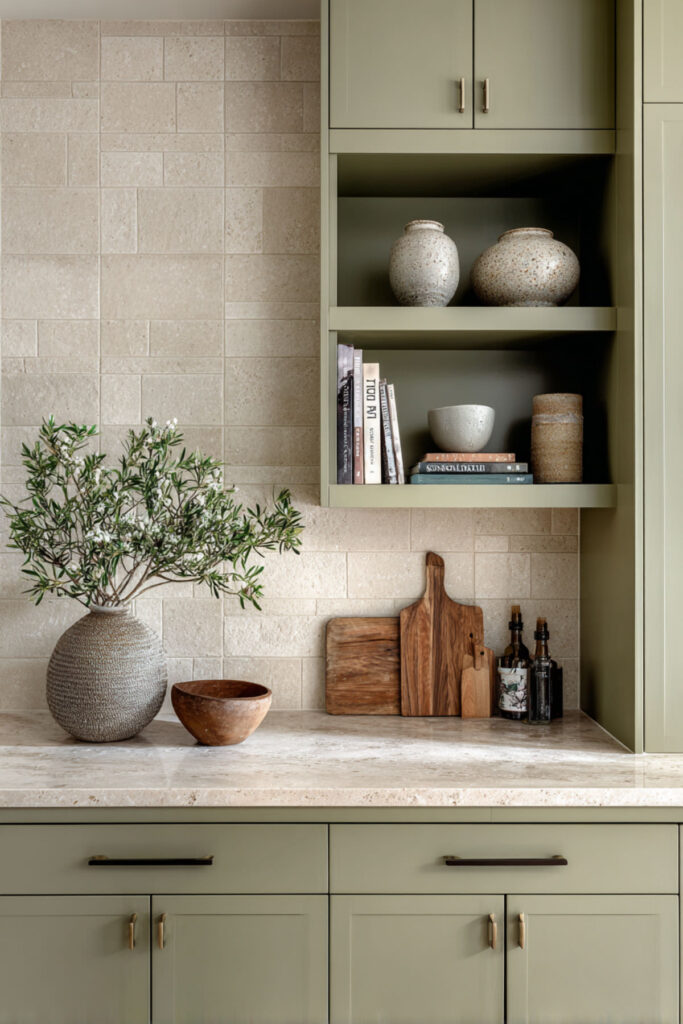 The title of this post is about warmth without clutter — and this idea takes that literally. In a cream and olive kitchen, keeping your countertops almost entirely clear (save for one or two beautiful items) lets the color palette and the materials do all the talking. A single olive green ceramic vase with a branch, a brass tray holding your salt and pepper, and nothing else. The kitchen breathes.