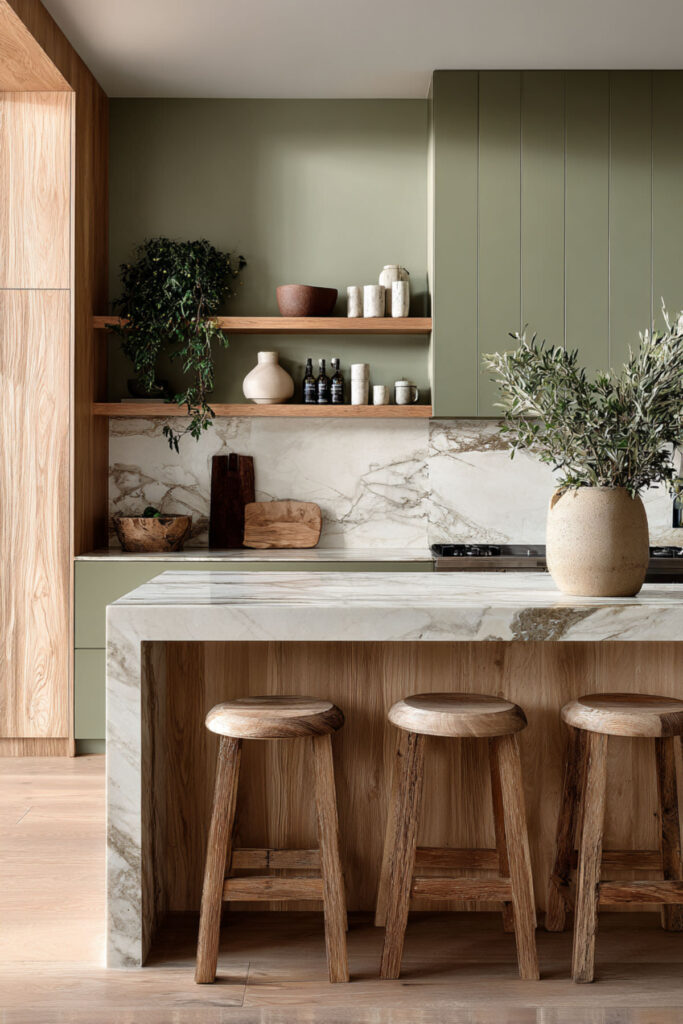 I recommend olive kitchen cabinets paired with natural oak floating shelves, an oak kitchen island, and cream quartz or marble countertops. The wood adds warmth and texture while the cream keeps surfaces clean and bright. Brass hardware is the ideal accent — it speaks to both the green and the gold in the wood. It’s an olive green and oak kitchen that’s warm, uncluttered, and built around materials that actually get better with age.