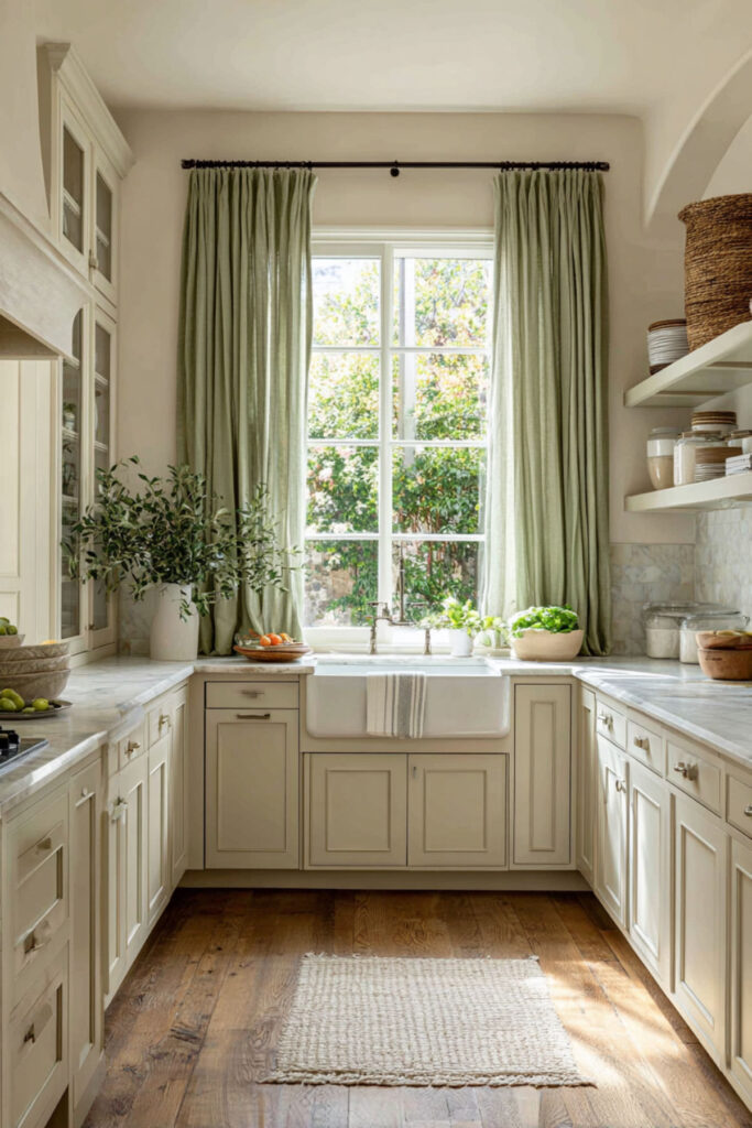 I recommend floor-length washed linen curtains in a warm olive green, hung just above the window frame on a simple brass or wood rod. Against cream walls and cabinets, the olive curtains frame the window and pull the outdoors into the room — especially when the green is visible against a garden or trees outside. It’s a change you can make in an afternoon, and it shifts the room more than you’d expect.