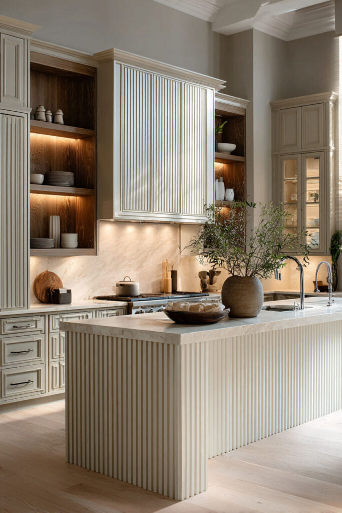 Fluted or reeded panel detailing on kitchen islands is one of the biggest micro-trends in kitchen design right now — it adds texture and architectural interest to what’s often a flat, plain surface. A cream fluted island set against olive green perimeter cabinets creates this gorgeous play between texture and color. The fluting catches shadows and adds depth to the cream, while the olive around it stays smooth and calm.