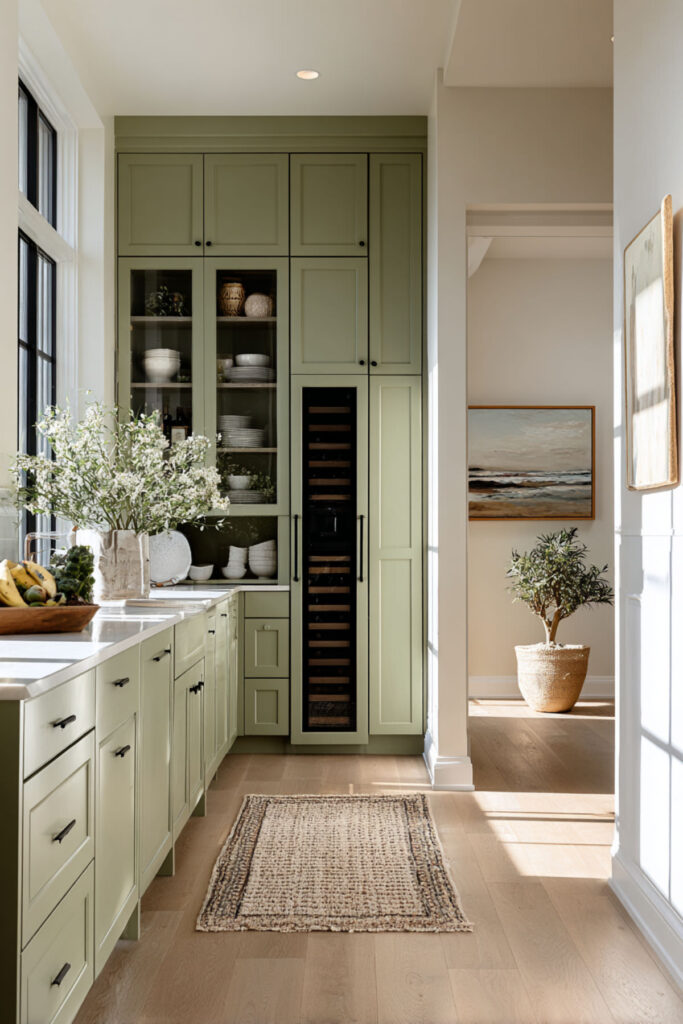 If you have a pantry or a butler’s pantry adjacent to your main kitchen, here’s a clever idea: keep the kitchen cream and paint the pantry olive green. The color shift when you walk from the bright cream kitchen into the deeper, moodier olive pantry is stunning — it feels like entering a private, curated space. And because the pantry is enclosed, you can go darker and bolder without affecting the kitchen’s brightness.