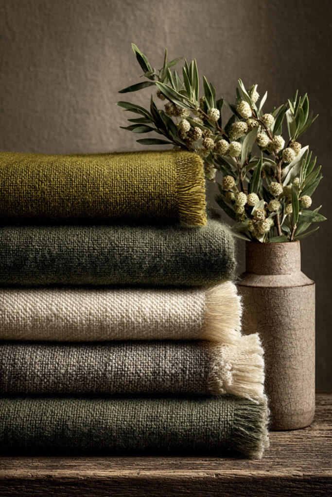 Textiles are the fastest way to make a kitchen feel warm and lived-in without adding any visual clutter to surfaces. An olive and cream textile layer — kitchen rug, dish towels, seat cushions, cloth napkins, a table runner — builds the palette through soft, moveable elements that add warmth underfoot and at hand level where you feel it most.
