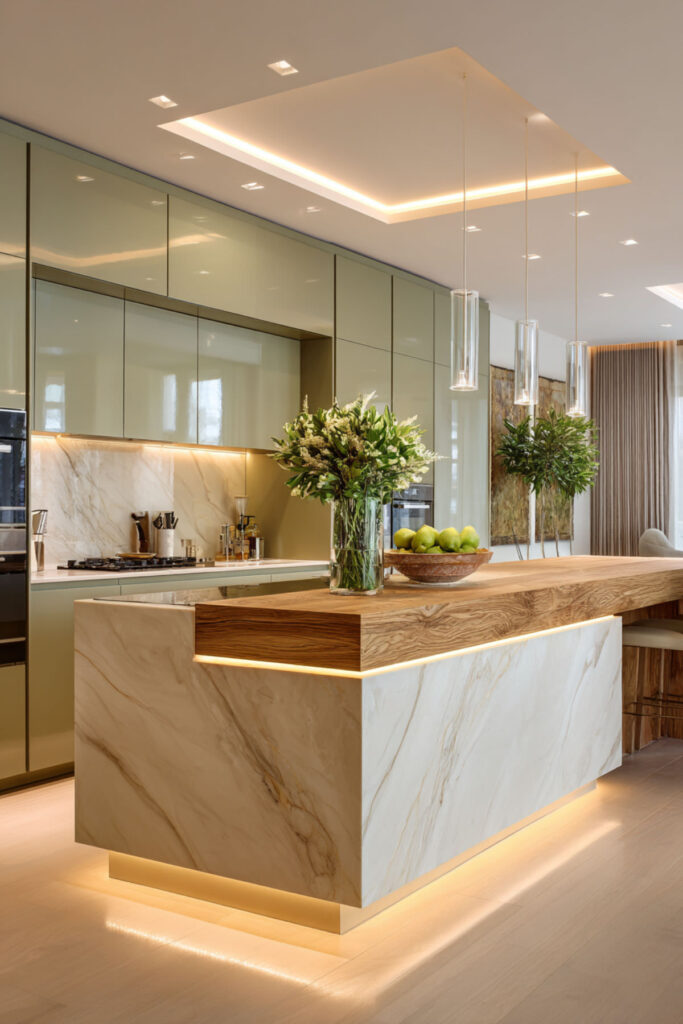 I recommend an oversized pendant light in a warm material — brass dome, woven natural fiber, or hand-blown glass — hung at the right height over the island. Against cream cabinets and olive walls (or the reverse), the light becomes the room’s centerpiece. It draws the eye up, defines the gathering point, and creates ambiance without a single extra object on the counter. Less stuff, more intention. That’s the whole philosophy.