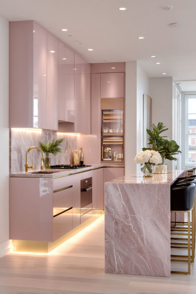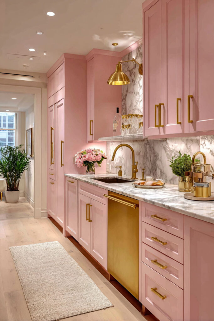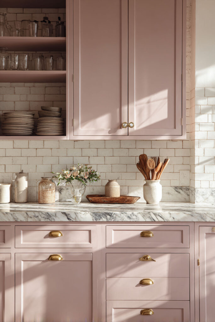 I recommend a dusky pink kitchen with matte cabinets, a Calacatta or warm-veined marble countertop and backsplash, and brass hardware throughout. The marble’s natural warmth prevents the pink from reading too cool, and the brass pulls everything into a warm, golden-toned family. It’s the kind of quiet luxury that doesn’t need a spotlight — it just glows on its own.