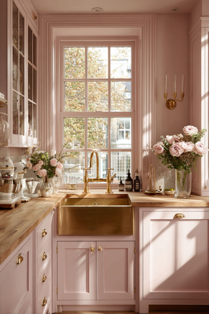 I recommend a wall-mounted or deck-mounted brass faucet in an unlacquered or brushed finish, set against a wall painted in a warm dusty rose. Add matching brass cabinet knobs if you want to carry the metallic further. The brass catches the light from every angle, and the pink wall behind the sink creates this warm, rosy glow that makes washing dishes feel slightly less terrible. A dusty rose kitchen doesn’t need to be dramatic to be beautiful.