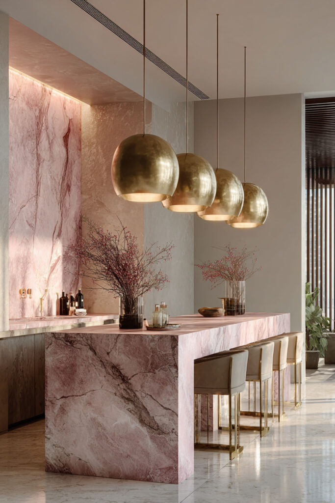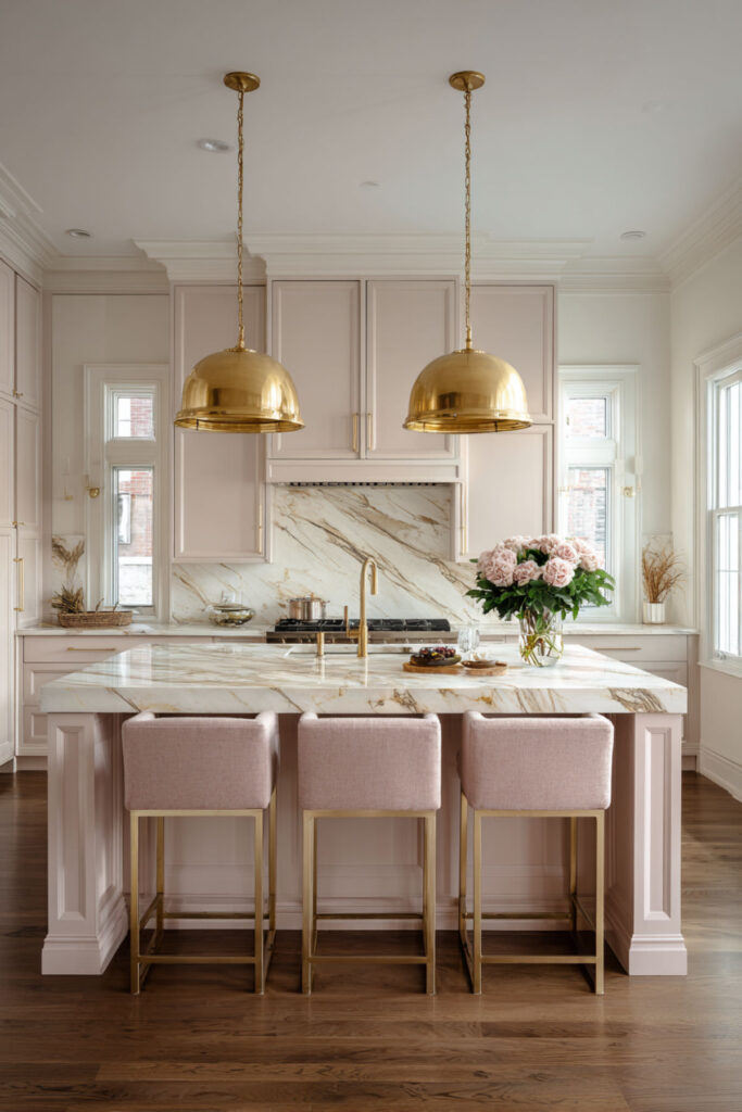 I recommend a substantial kitchen island in matte dusty pink with a white marble or warm quartz top, and two or three brass pendant lights hung at staggered heights above. The pendants can be anything from sleek brass domes to vintage-inspired glass-and-brass fixtures — the key is that warm metallic glow that complements the pink. It’s the kind of setup you’d see in a gorgeous renovated brownstone in Georgetown and immediately want to copy.