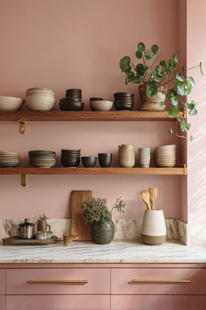 I recommend thick wood floating shelves with exposed brass brackets mounted on a muted pink kitchen wall. Stack the shelves with white dishes, amber glass bottles, a few cookbooks, maybe a small brass clock. The warm muted pink wall makes everything displayed on the shelves look warmer and more intentional. It’s dusty pink kitchen walls done in a way that’s functional and effortlessly sophisticated.