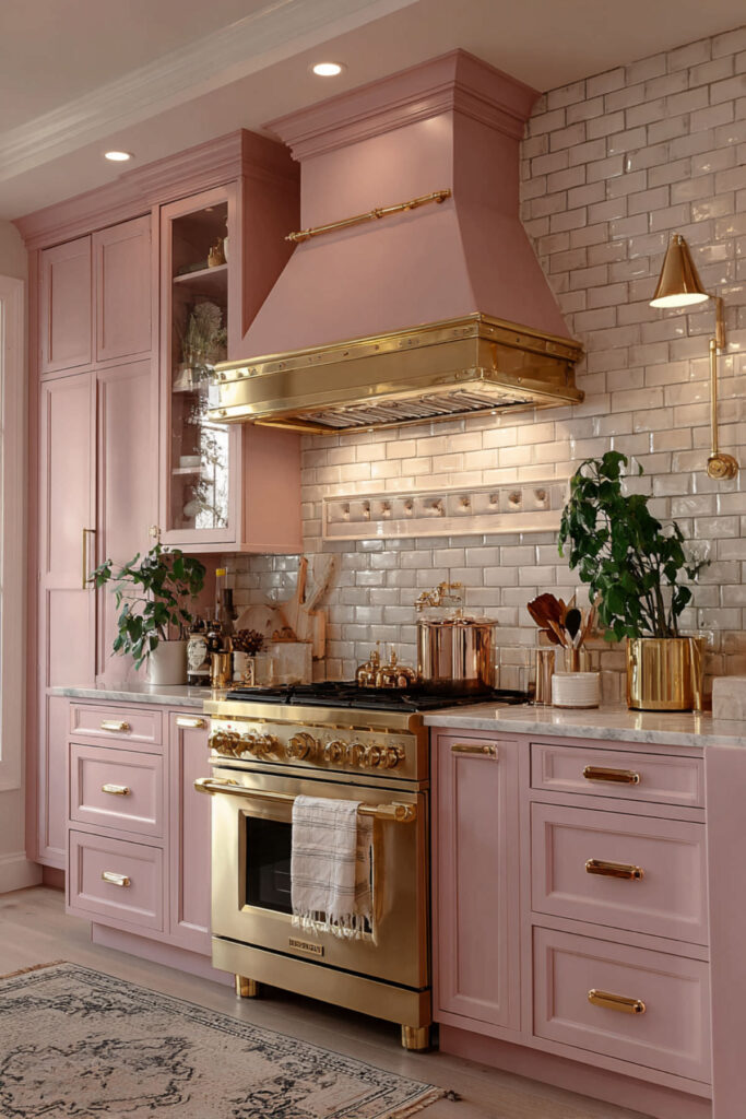 I recommend a custom or semi-custom brass range hood in a hammered, brushed, or polished finish, flanked by dusty pink cabinets with matching brass hardware. A marble backsplash behind the range bridges the two finishes beautifully. It’s the kind of kitchen detail that makes the whole room feel like it was designed by someone with a very confident point of view. Because it was — that someone is you.
