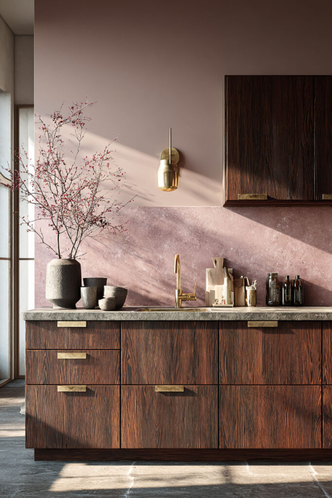 I recommend a pink and walnut kitchen with dusty pink painted cabinets and a walnut island or walnut floating shelves. Brass cup pulls on the pink cabinets and brass pendant lights over the walnut island bring the metallic warmth into both zones. The result is a kitchen that feels collected and intentional — like each material was chosen because it genuinely belongs there, not because it was on trend.
