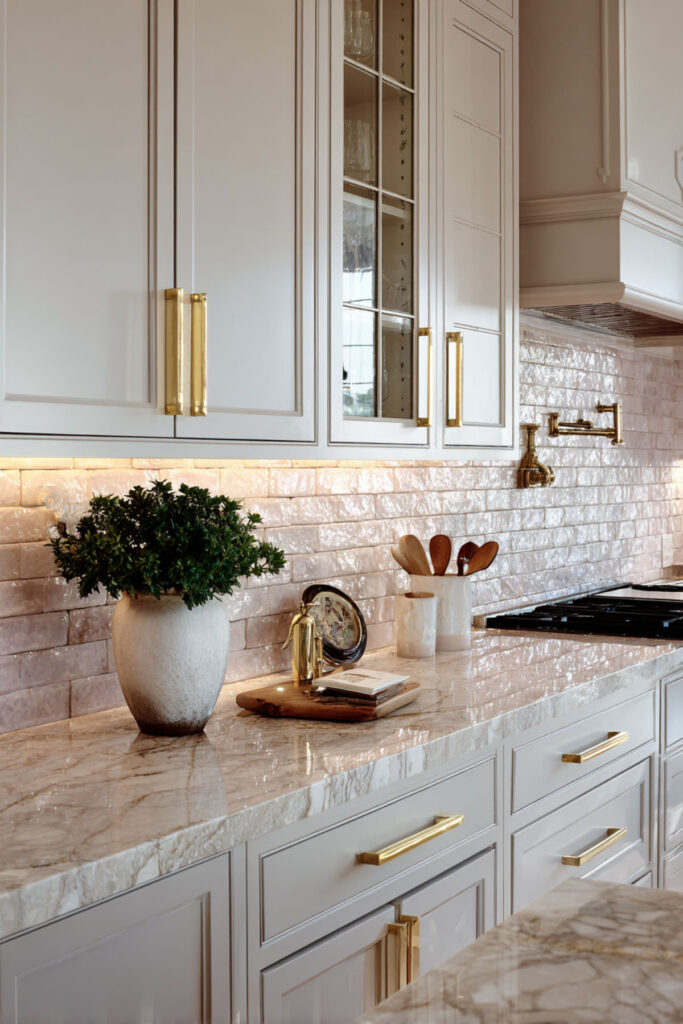 I recommend zellige-style tiles in a soft dusty pink with warm-toned grout and a slim brass trim strip at the top edge where the tile meets the wall. Against white or cream cabinets, the pink tiles become the kitchen’s signature feature. It’s a backsplash that people notice immediately, ask about, and remember. And that subtle brass detail at the edge? That’s the finishing touch that makes it feel truly polished.
