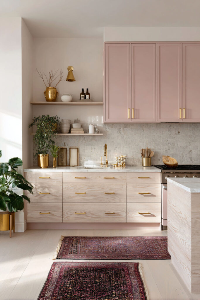 I recommend dusty pink lower cabinets with natural oak upper shelving or an oak island top, tied together with brass knobs and pulls. The wood introduces texture and organic warmth, while the brass gives the whole palette a polished finish. A pink and wood kitchen with brass accents feels like something you’d find in a thoughtfully designed farmhouse hotel — beautiful, functional, and completely welcoming.