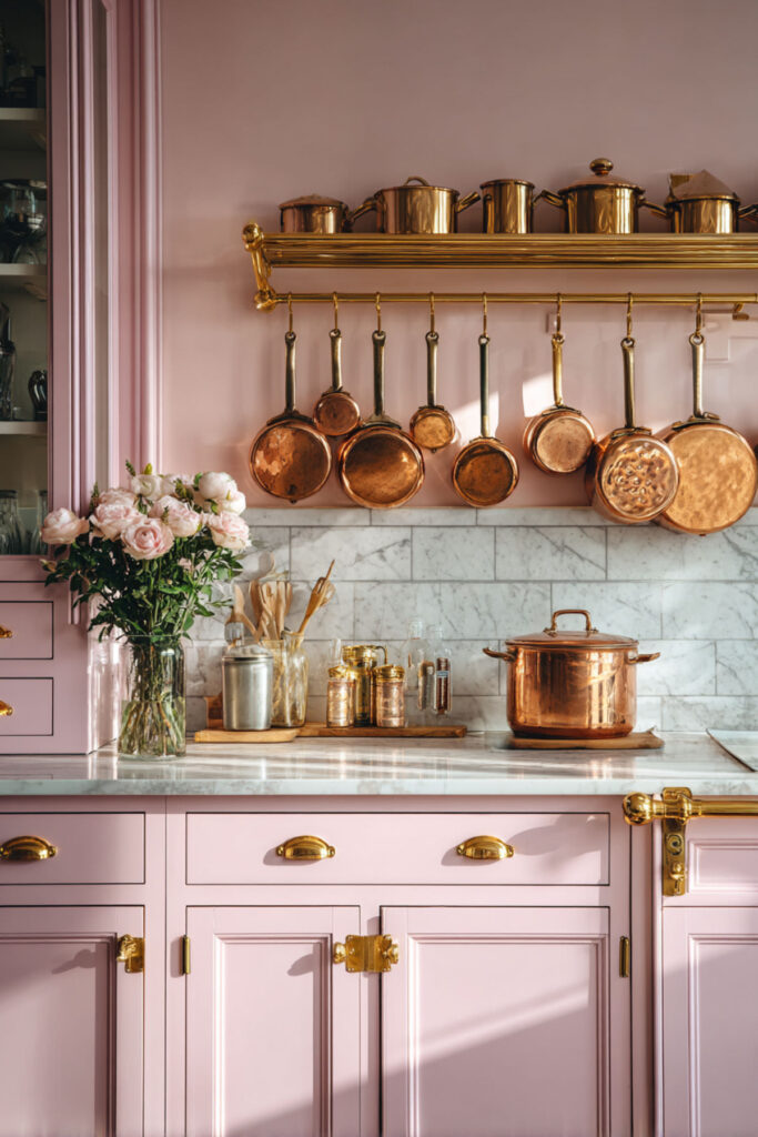 A brass pot rail is one of those kitchen details that is both gorgeous and genuinely useful — especially if you love cooking and want your favorite pans within arm’s reach. Mounted on the wall above your range or along a backsplash, a brass rail with hooks turns your cookware into a display, and against soft pink kitchen cabinets, the warm metal and copper-bottomed pots become part of the decor.