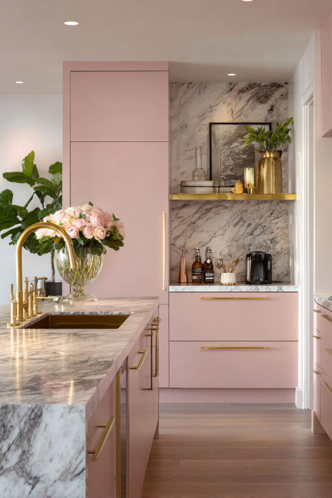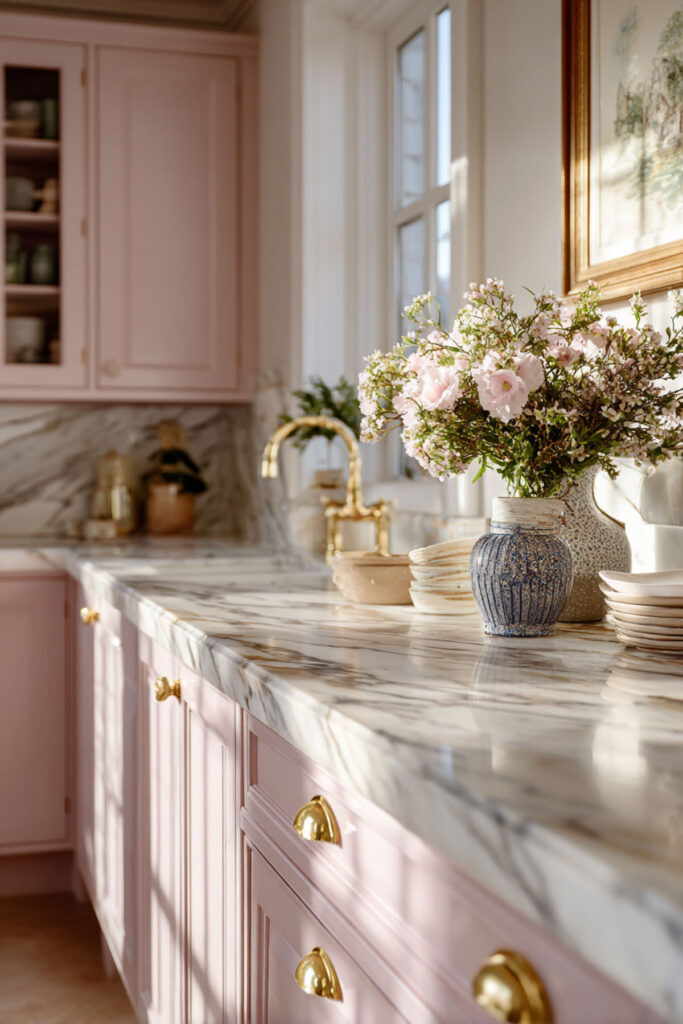 Marble, dusty pink, and brass together create a trio that feels undeniably luxurious. The soft veining in marble naturally carries hints of pink, gold, and gray, which means it acts as a bridge between the dusty pink cabinets and the brass hardware. When all three come together, the kitchen feels like it was designed as a single, cohesive piece.