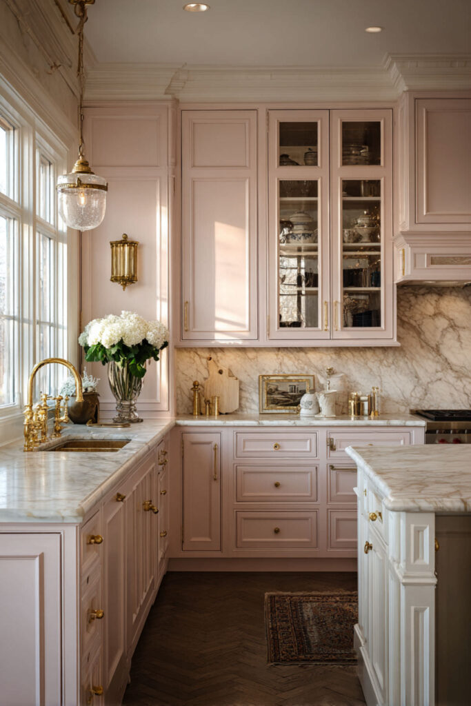 A Dusty Pink Kitchen With Brass-Framed Glass Cabinets