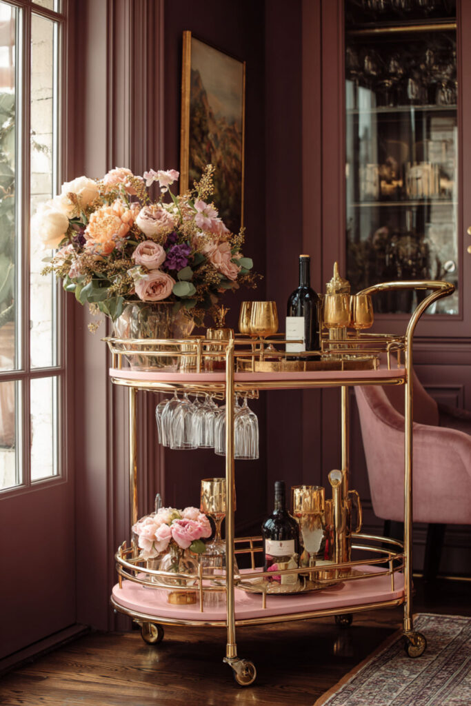 Here’s an idea that requires zero renovation and looks incredible. A brass bar cart in the corner of your kitchen — styled with dusty pink accessories, a few beautiful bottles, glassware, maybe a small pink candle or a vase of dried flowers — brings the whole dusty pink and brass palette into the room through one single piece of furniture.