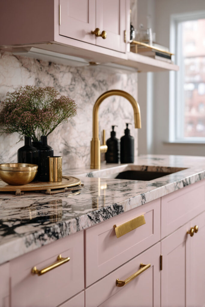 Some people worry that dusty pink and brass together will feel too soft, too precious. If that’s you, here’s the fix: add black. A few matte black elements — a black faucet, black window frames, a black light fixture — inject just enough edge to keep the palette from tipping into sweet territory. The black anchors the pink, the brass warms the black, and suddenly the kitchen feels balanced and modern.