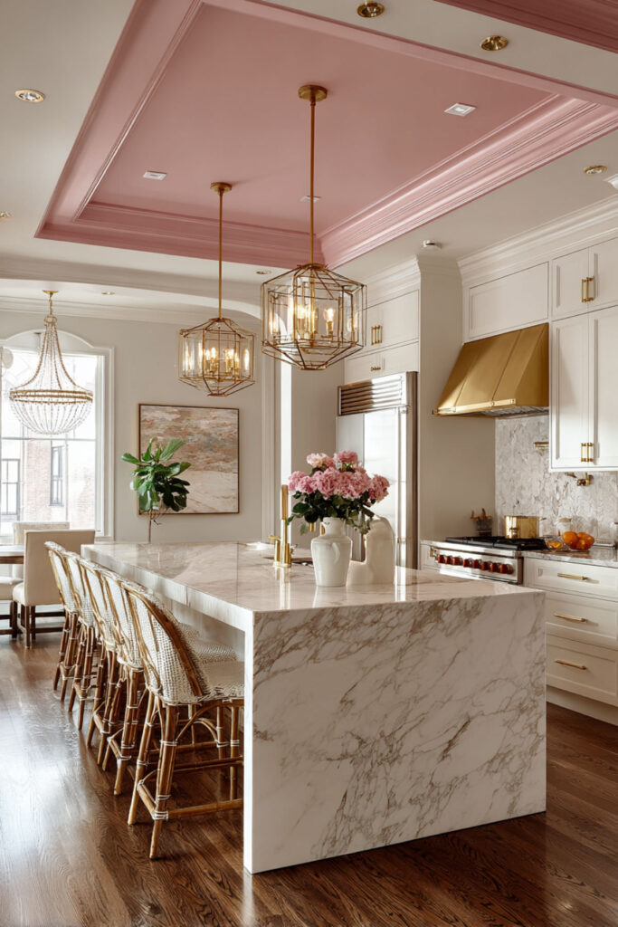 Dusty Pink Ceiling in a Brass-Accented Kitchen