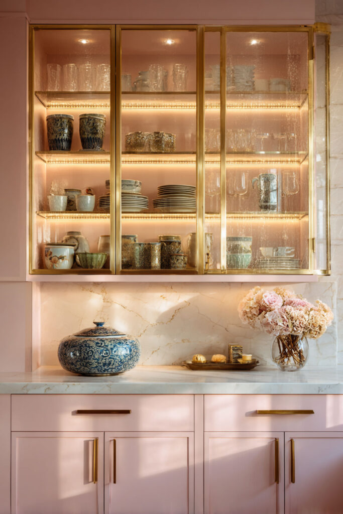 Glass-front cabinets are already a beautiful detail — they add depth, let you display your prettiest pieces, and break up solid runs of cabinetry. Now add brass frames around the glass. Against dusty pink cabinet bodies, the brass-framed glass doors become these jewel-like moments on the wall, catching light and adding a layer of refinement that solid doors just can’t achieve.