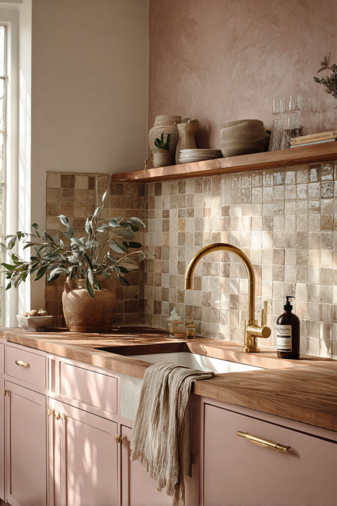 I came across this trending idea and I think it’s one of the most elegant ways to introduce dusty pink into a kitchen without touching the cabinets. A hand-glazed dusty pink tile backsplash — zellige, scalloped, or fish-scale — with metallic brass trim or brass-toned grout creates this luminous, textured wall that catches light beautifully throughout the day.