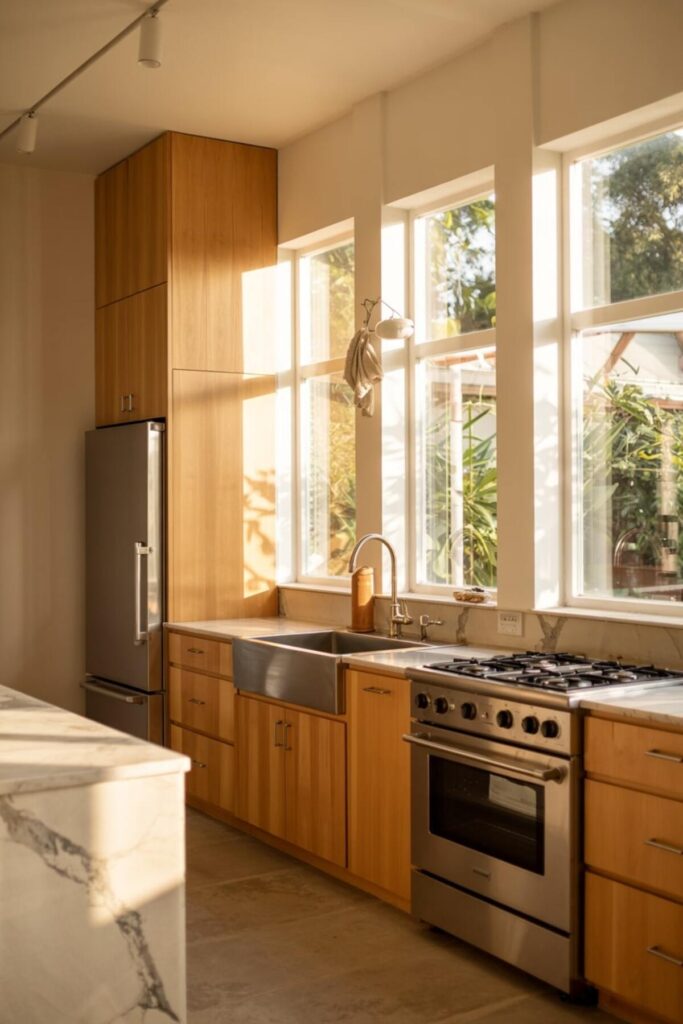 Sometimes simple kitchen plans work best for complicated family schedules. One long counter for everything, clearly divided into stations. Open shelving for visibility (kids can’t claim they couldn’t find something). A single large table for eating, homework, and projects. The simplicity reduces decision-making during chaos.