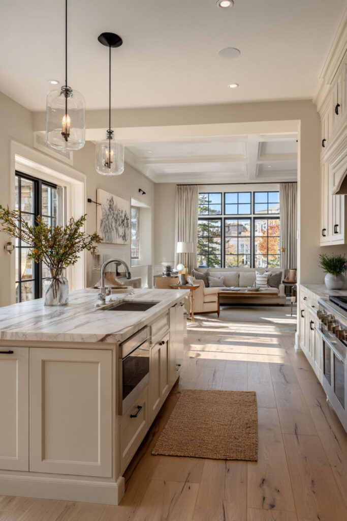 The kitchen family room layout open concept means never losing track of who’s doing what. While you’re prepping dinner, kids spread out with homework – some at the island, others on the couch, maybe one at the dining table. The open flow allows supervision without hovering.