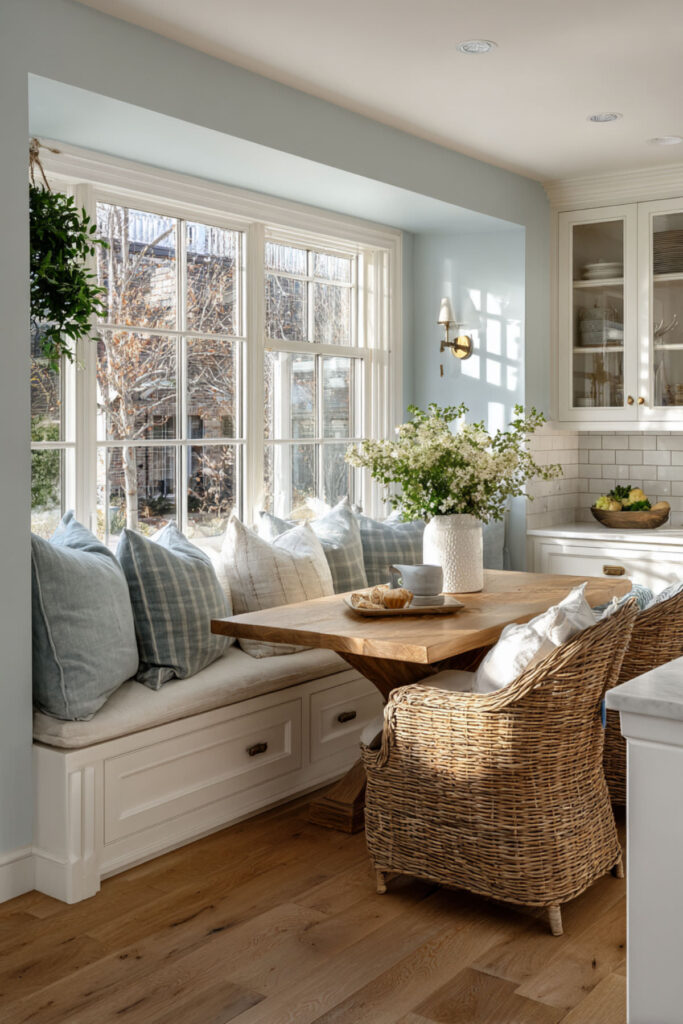 The banquette table can hold multiple kids’ projects without taking over the entire kitchen. Built in seating means no chairs to tip when kids inevitably lean back. This spot transitions from homework to family dinner to late-night study sessions seamlessly.